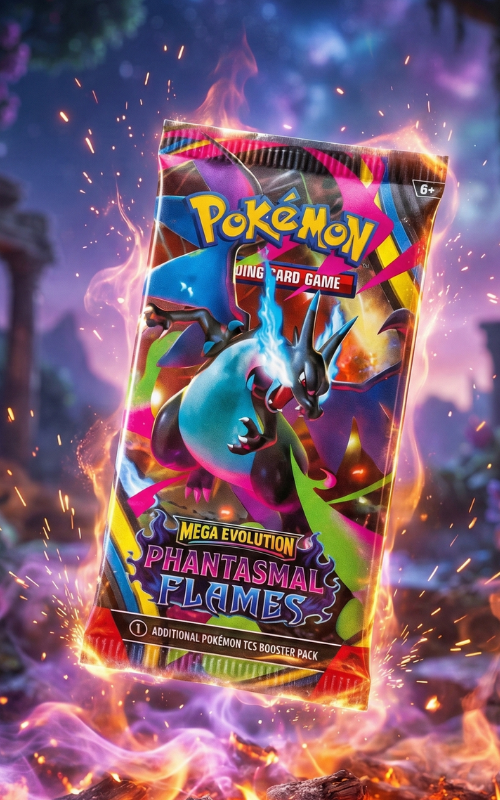 etreed een mysterieuze wereld vol kracht, strategie en verzamelplezier met de Pokémon TCG Mega Evolution: Phantasmal Flames Booster Pack.